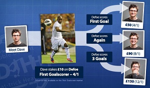 Back your man to score the first with us and if he goes on to grab a second, we’ll double your first scorer price - and if he bags a hat-trick we’ll treble it!